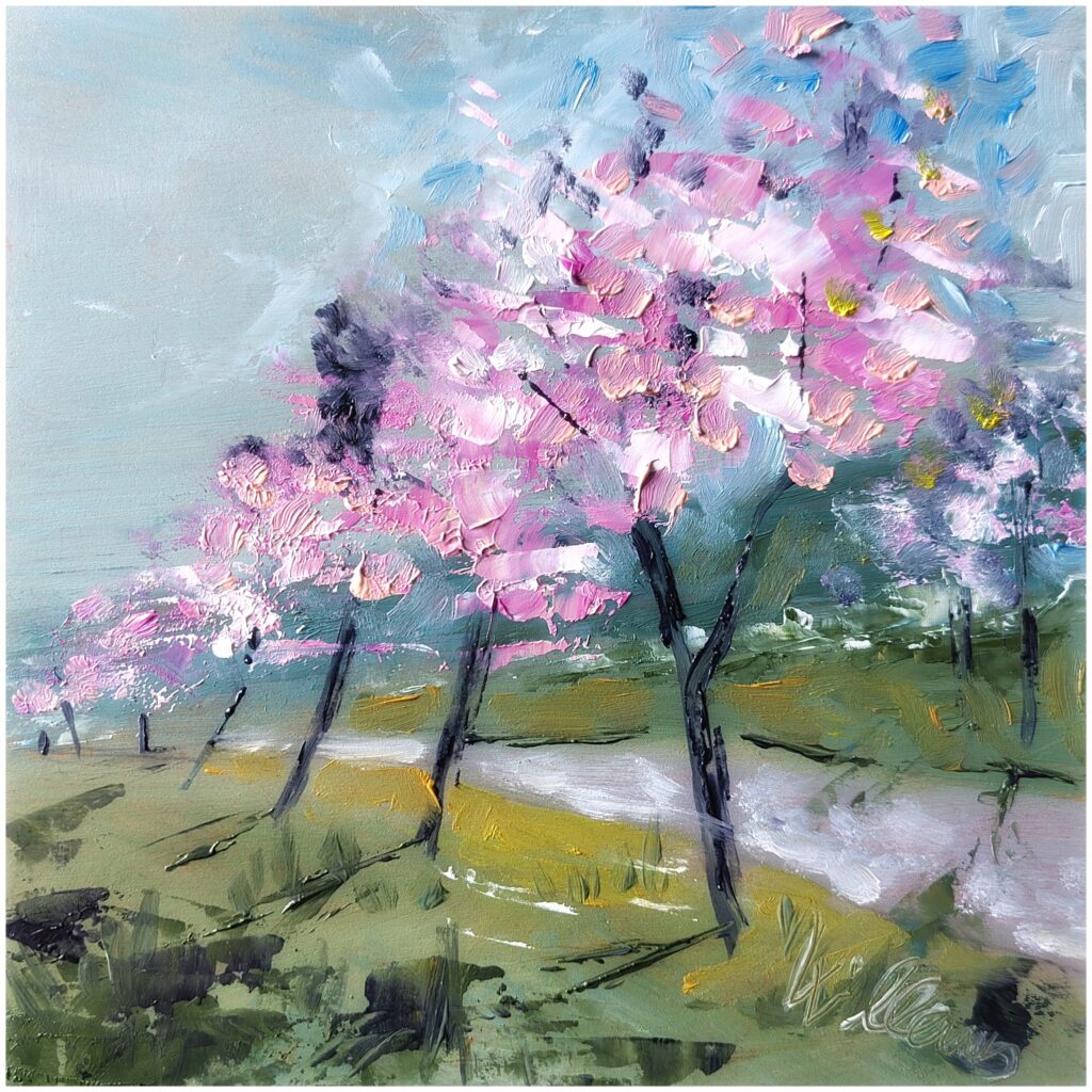 blühende Bäume im Frühling, Öl auf Malkarton, 40×40 cm