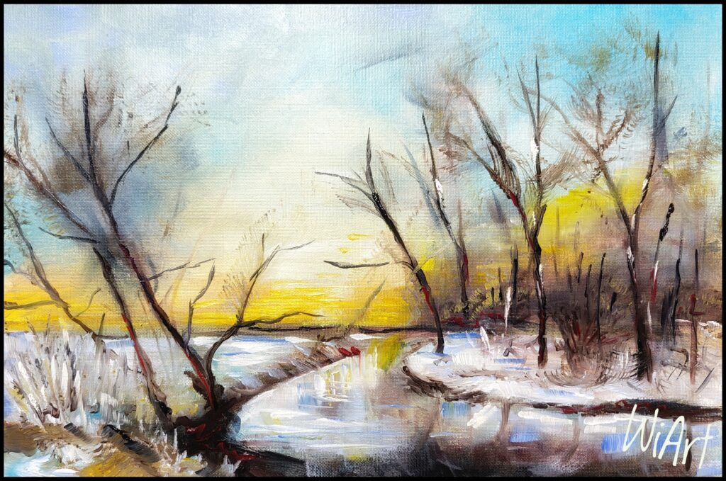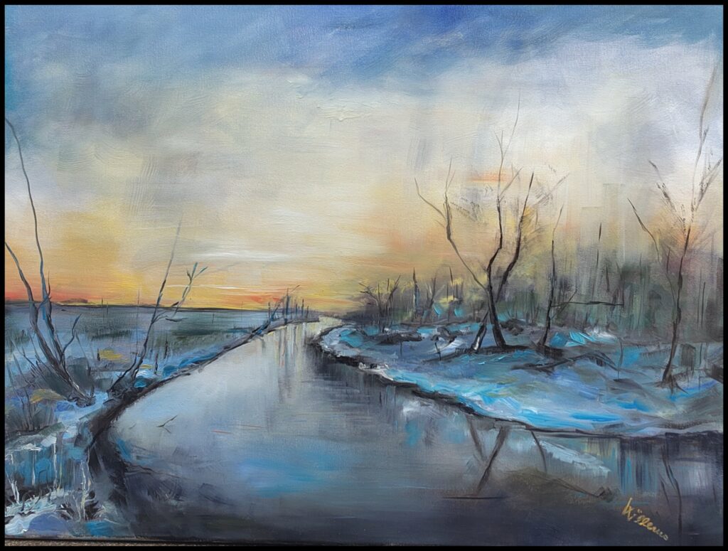 Winterlandschaft, am kleinen Fluss, Öl auf Malkarton, 30×20 cm