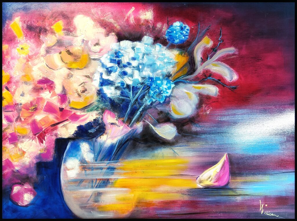 blaue Hortensie im Magnolienstrauß, Öl auf Leinwand, 80×60 cm