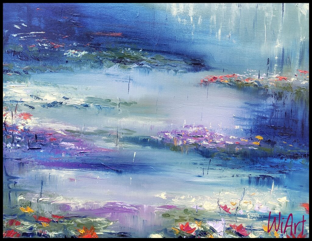 Seelandschaft mit Seerosen, halbabstrakt, Öl auf Leinwand, 20×20 cm