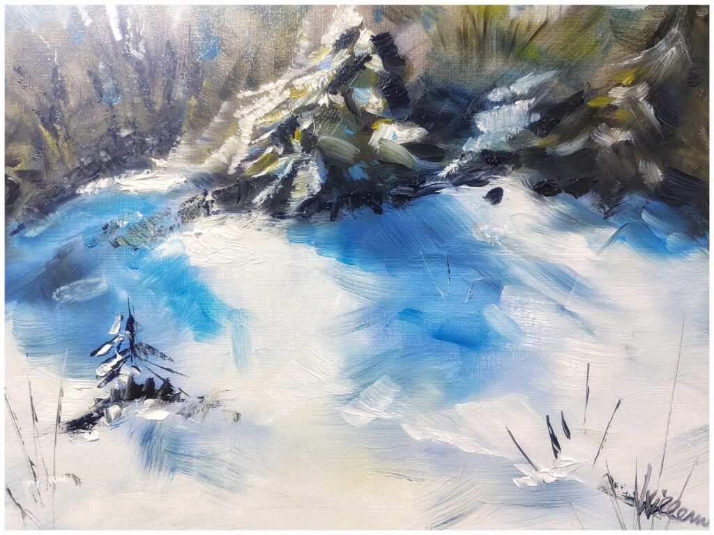 Winterklang Blau- und Brauntöne komponiert zu abstrakter winterlicher Landschaft, Acryl auf Leinwand, 60×50 cm